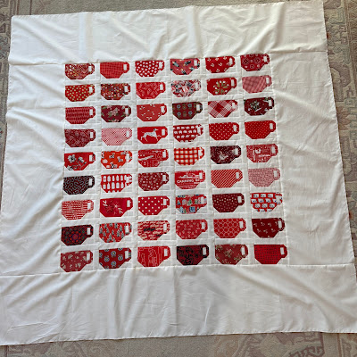 The tea cup quilt is wonderful! It is so fun to see all the different prints! That backing is great and will look so cool on the back!